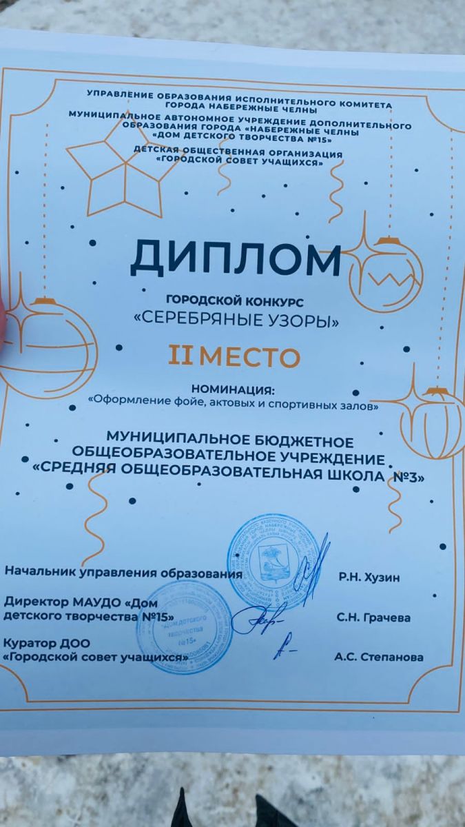 По результатам конкурса на лучшее оформление фойе школы и актового зала к Новому году «Серебряные узоры» наша школа заняла 2 место..