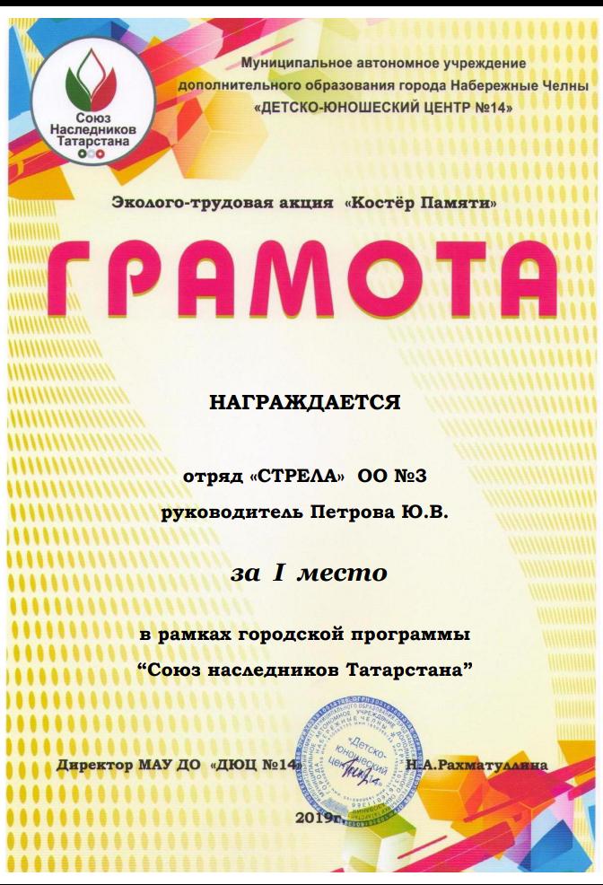 Поздравляем отряд "Стрела" (руководитель Петрова Ю.В.), занявшего 1 место в эколого-трудовой акции "Костер Памяти", в рамках городской программы "Союз наследников Татарстана" ГРАМОТА