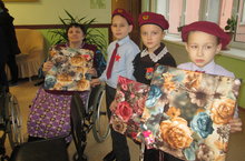 Тимуровские отряды «Забота» 4Б кл. и «Наследники» 3Б кл. участвуя в городской акции «Так просто быть рядом», в рамках декады инвалидов посетили дом-интернат. Ребята вручили инвалидам-колясочникам 15 подушечек, бабушкам, которые вяжут, подарили 10 мотков разноцветной пряжи. Тимуровцы 4Б кл. провели с ветеранами турнир по шашкам и шахматам. А также тимуровцы навестили семью Шишкиных, в которой живут братья-инвалиды Алексей и Александр, и семью Мусиных, где бабушка инвалид детства. Тимуровцы выполняют девиз своего отряда «Твори добро, и оно к тебе вернётся!»