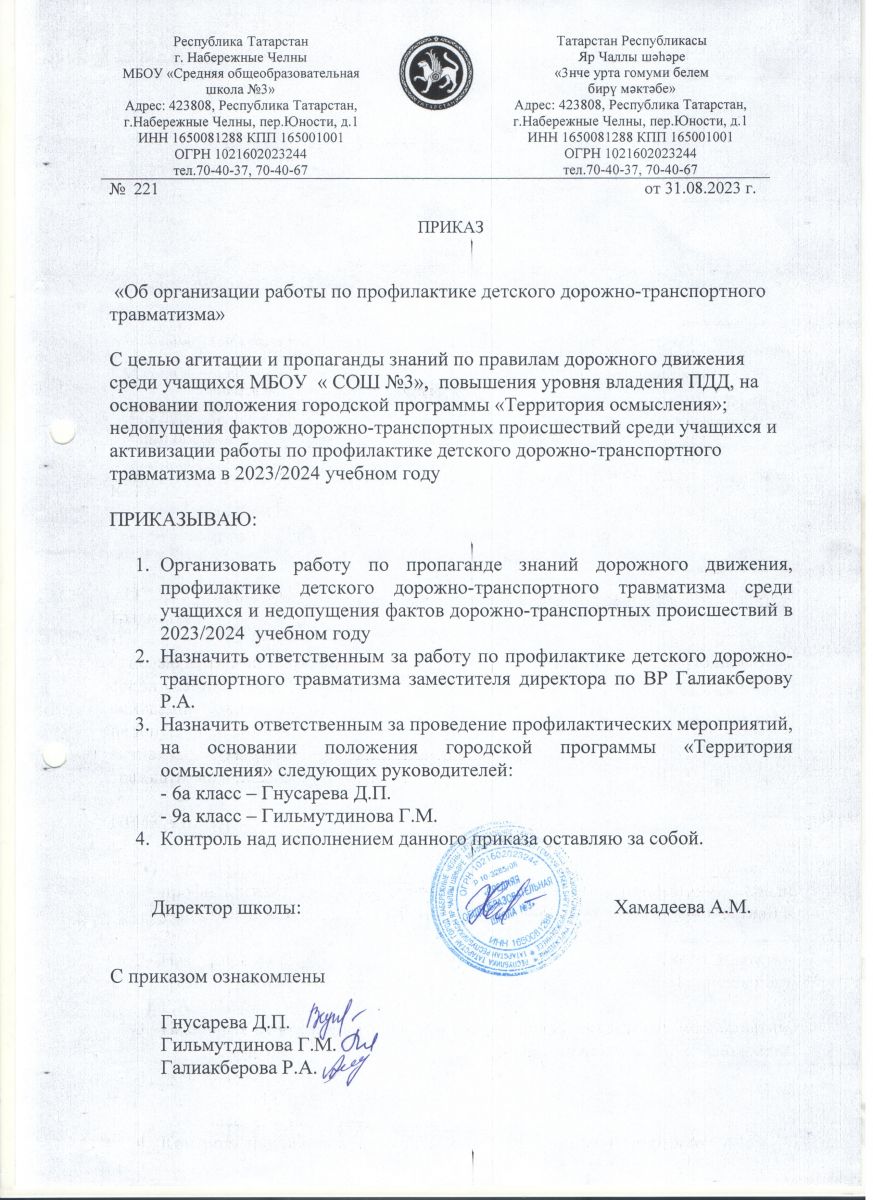 Приказ №221 от 31.08.2023 «Об организации работы по профилактике детского дорожно-транспортного травматизма»