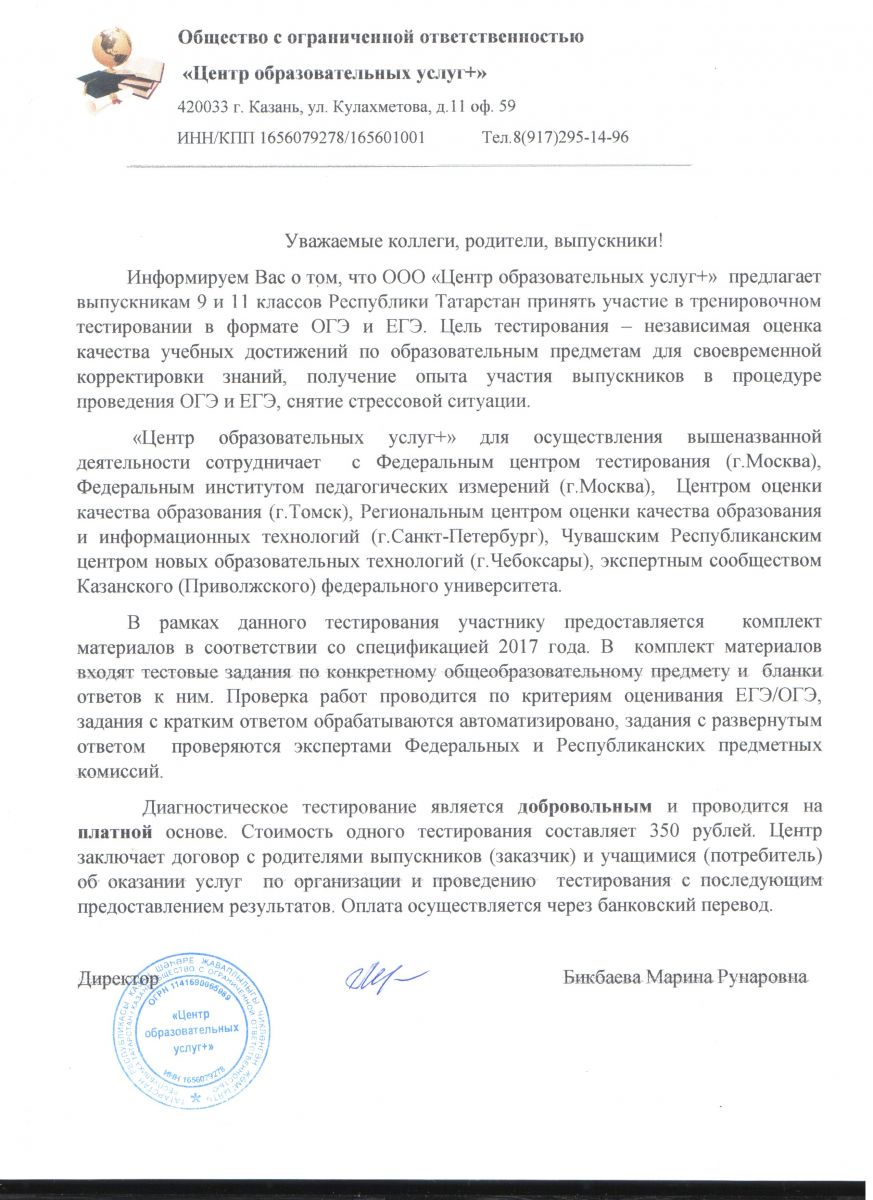Опубликовано: 23.11.2016В соотвествии с План-графиком по подггтовке к Государственной итоговой аттестации 2017 года выпускников 9, 11 классов с 24 декабря по 16 января в г. Набережные Челны при участиии ООО "Центр образовательных услуг+" г. Казань совместно с Федеральным центром тестирования (г.Москва), Федеральным институтом педагогических измерений (г.Москва), и Региональным центром оценки качества образования и информационных технологий (г.Санкт-Петербург), экспертным сообществом Казанского (Приволжского) федерального университета пройдут тренировочные тестирования в формате ЕГЭ ОГЭ по русскому языку, математике, и предметам по выбору на добровольной коммерческой основе.