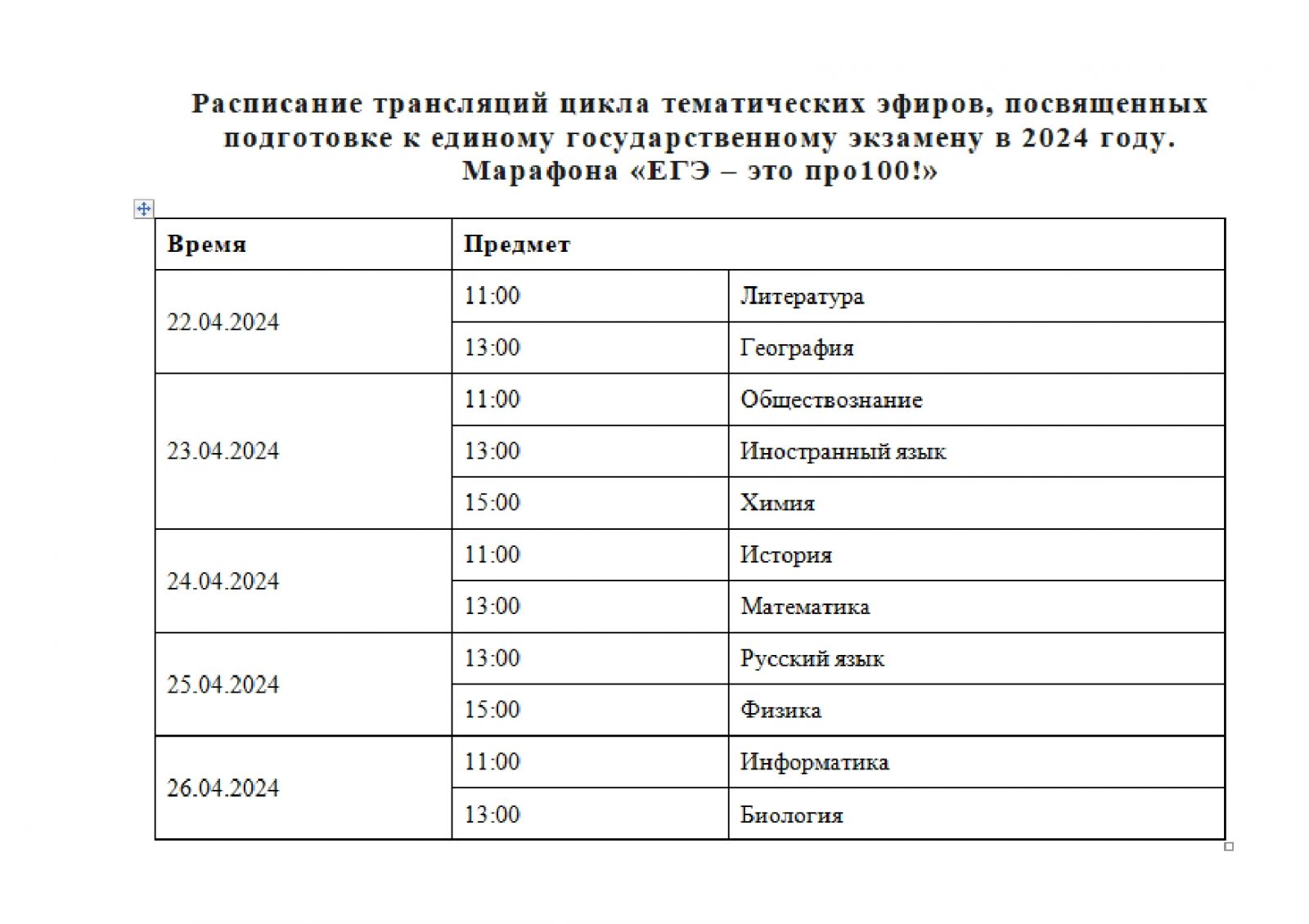 Цикл тематических эфиров пройдет в период с 22 по 26 апреля 2024 года в соответствии с расписанием трансляций, указанного в приложении к письму.