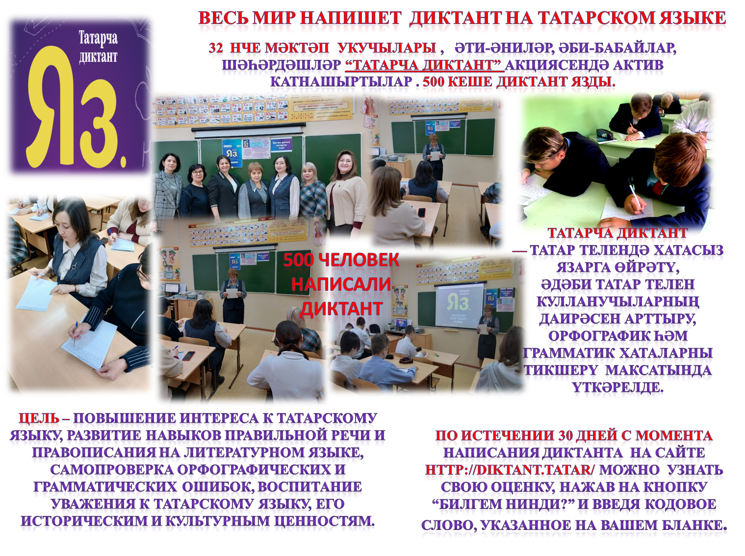2022 елның 25-27нче ноябрь көннәрендә мәктәптә "Татарча диктант" татар теленнән дөньякүләм белем тикшерү акциясе уза. "Татарча диктант" акциясе мөстәкыйль рәвештә татар телен өйрәнүгә, дөрес язу күнекмәләрен үстерүгә юнәлдерелгән. Акциядә һәр кеше катнаша кала. Ел саен диктант язуда безнең мәктәп укучылары, ата-аналар, укытучылары актив катнаша. Быел Татарстан Республикасыннан катнашучылар татар язучысы, драматург, автор-башкаручы Зөлфәт Хәким әсәреннән өзек язачаклар. Бүген акциянең беренче көне булуга карамастан, инде 300дән артык укучы һәм ата-ана диктант язуда катнашты.