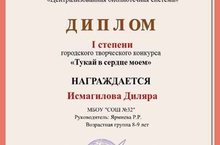 22нче марттан 28нче мартка кадәр Яр Чаллының 17нче номерлы балалар китапханәсендә “Тукай минем йөоәгемдә” исемле видео конкурс уздырылды. 2нче сыйныф укучысы Исмагилова Диляра I дәрәҗә диплом белән бүләкләнде. Котлыйбыз! -