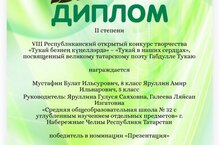 Каждый год учащиеся нашей школы успешно принимают участие в Республиканском Открытом конкурсе Творчества "Тукай безнең күңелләрдә" - “Тукай в наших сердцах”, посвященный великому татарскому поэту Габдулле Тукаю. (В Республиканском конкурсе презентаций и проектных работ - Диплом за II место! В городском конкурсе газет и плакатов - Диплом за I место!). От всей души поздравляем ребят и их руководителей с наградами и желаем творческих успехов”.