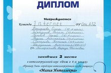 Поздравляем команду Internet, учителя математики Тимерханову Н.Ф., занявшую 2 место в интеллектуальной игре "Дом о 4-х углах", "Премьер Лиги" городского интеллектуального клуба учащихся "Магия интеллекта"