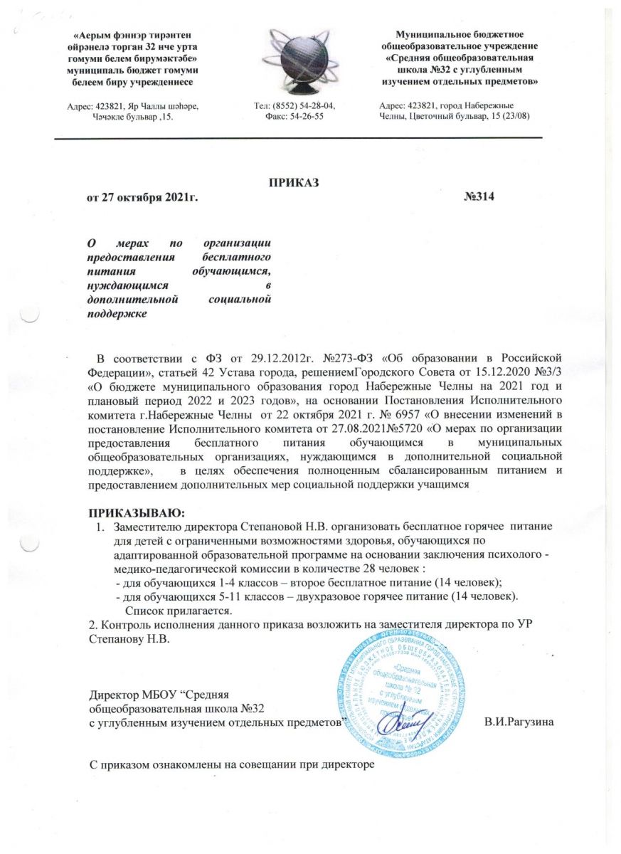 Приказ №314 от 27.10.2021 года "О мерах по организации предоставления бесплатного питания обучающимся, нуждающимся в дополнительной социальной поддержке"Стоимость питания в образовательных учреждениях г.Набережные Челны