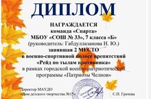 7Б сыйныфы командасы "Чаллы патриотлары" шәһәр программасы кысаларында "Дошман тылы буенча рейд" шәһәр хәрби-спорт ярышында 2 урынны яулады.