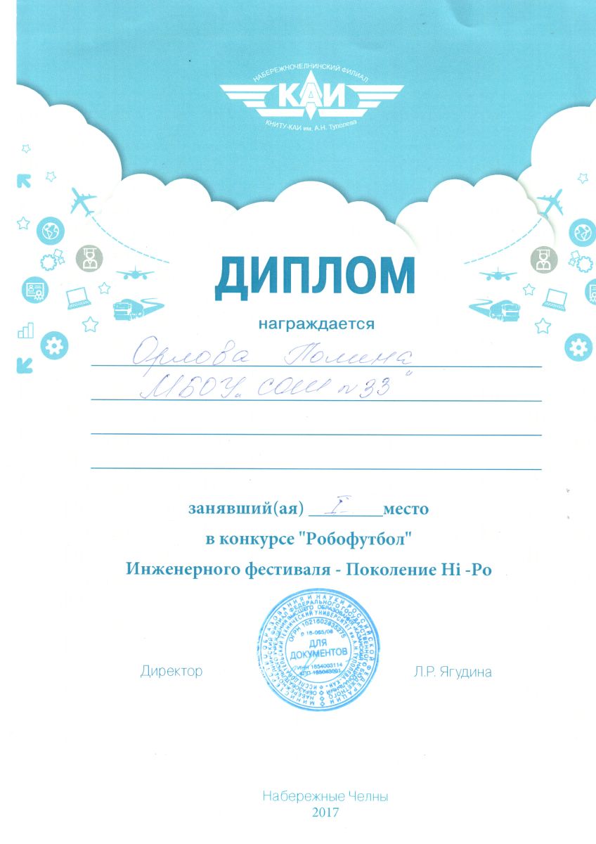 С целью реализация профориентационной работы среди выпускников 7-9-х классов, мотивации учеников на выбор инженерно-технических профессий для дальнейшего обучения, стимулирования научно-исследовательской деятельности и интереса у обучающихся к робототехнике, в соответствии с планом профориентационной работы с учащимися на 2017/2018 учебный год, команда учащихся нашей школы под руководством учителя физики Гатауллиной Лейса Габдулхаковны была направлена на Инженерный фестиваль «Поколение Hi-Po», проводимый на базе Набережночелнинского филиала КНИТУ им. А.Н. Туполева – КАИ. Программа фестиваля включала мастер-классы, лекции и бои готовых роботов. Все участники фестиваля получили сертификаты. Орлова Полина (9б класс) одержала победу в Робофутболе и получила диплом победителя.
