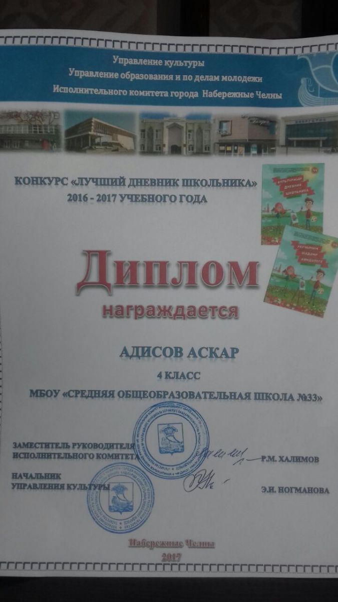 19.05.2017 в Органном зале прошло торжественное мероприятие, посвященное чествованию победителей в республиканском проекте "Культурный дневник школьника". Были приглашены лучшие ученики школ города. Ученик 4а класса нашей школы, Адисов Аскар, стал победителем. Учитель Гурьянова Роза Хамитовна.