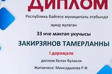 "Илһамлы каләм" республика күләмендәге иҗат бәйгесенең шәһәр этабына йомгак ясалды. Бәйгенең шигъри әсәрләр белән бәйле номинациясендә мәктәбебезнең 6 б сыйныфы укучысы Закирҗанов Тамерлан 1 урын алды. Җиңүчене һәм җитәкчесе Рузилә Флюр кызын котлыйбыз, иҗади уңышлар телибез.