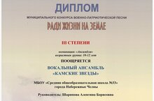 Поздравляем учащихся 6А класса с дипломом 3 степени в конкурсе военно-патриотической песни "Ради жизни на земле". Желаем новых успехов!
