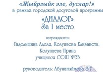 Наши звездочки : Колупаева Елизавета,Гадельшина Аделя из 7 Б класса,Колупаева Ирина из 4 Б класса участвовали в конкурсе музыкального искусства "Жырлыйк эле, дуслар!" в рамках городской досуговой программы 'Диалог" и заняли 1 призовое место.Так держать,девочки!!!