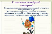 Начались весенние каникулы и продолжатся они с 22 по 30 марта. Ждем ребят в школу 31 марта. Будьте осторожны на дорогах и проведите с пользой весенние каникулы, чтобы 4 четверть была на высоте.