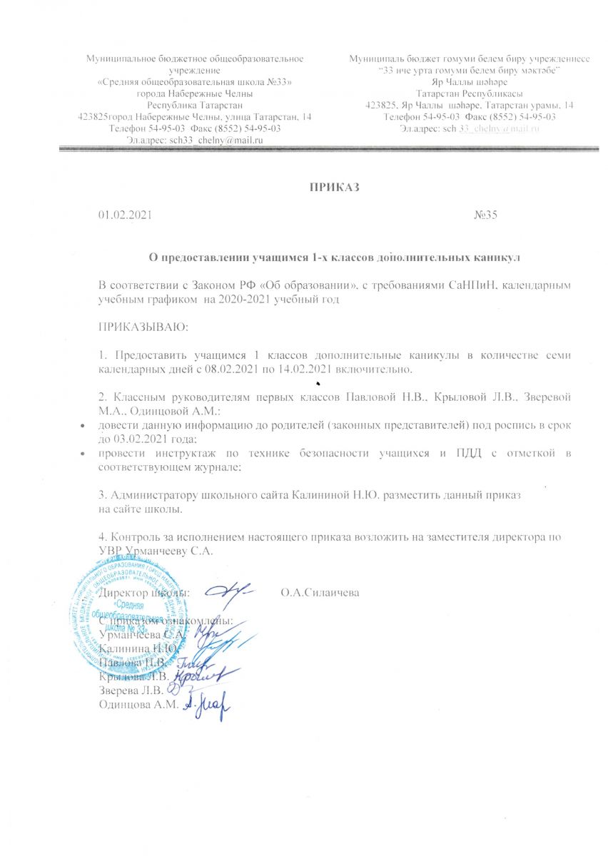 Дополнительные каникулы в 1-х классах 02.02.2021