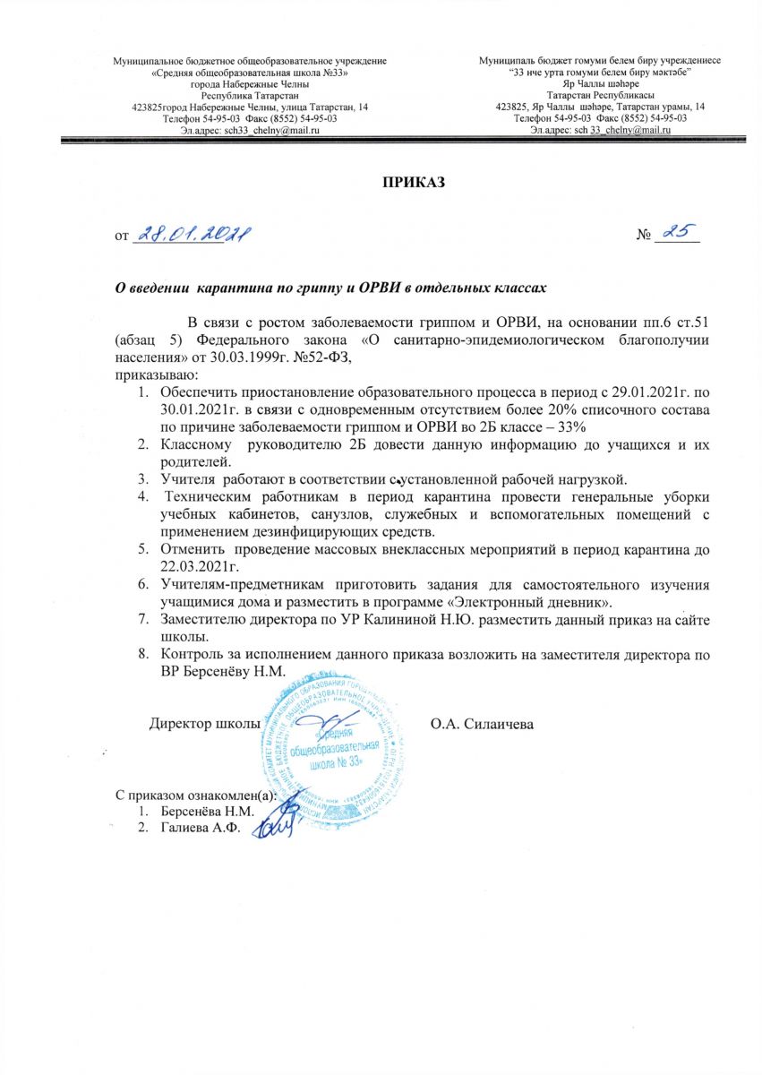 В связи с ростом заболеваемости гриппом и ОРВИ, на основании п.6.ст. 51 Федерального закона "О санитарно-эпидемиологическом благополучии населения" от 30.03.1999 №52 ФЗ сообщаем о преостановлении образовательного процесса в период с 29.01.21 по 30.01.21 в связи с одновроеменным отсутствием более 20%списочного состава по причине заболеваемости гриппа и ОРВИ во 2б классе -33%