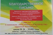 Прикамское территориальное управление Министерства экологии и природных ресурсов Республики Татарстан выражает благодарность школе 34 за активное участие в мероприятиях по сбору макулатуры . Школа собрала и сдала 13,660 тонн макулатуры. Спасибо всем за участие и заботу о природе.