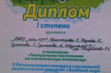 Поздравляем 3 а класс и руководителя Мирзаянову Р.З. с победой во II Региональном конкурсе социальной экологической рекламы "Зелёный мир", в номинации "Театральная постановка на экологическую тематику". Желаем дальнейших творческих идей.