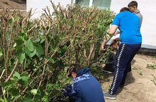 Не смотря на каникулы, работа на пришкольном участке кипит. Ребята пропалывают грядки, подстригают кусты. Подметают территорию.