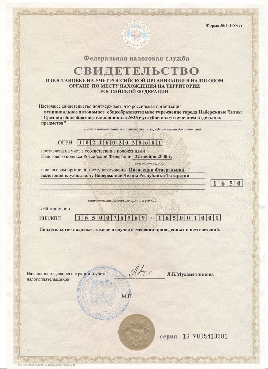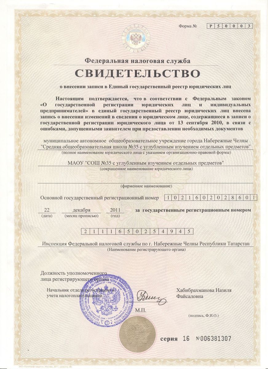 - Постановление Исполкома №5620 от 03.09.2010г. "О создании муниципального автономного общеобразовательного учреждения города Набережные Челны "Средняя общеобразовательная школа №35 с углубленным изучением отдельных предметов"