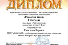 Поздравляем Газизову Зарину - победителя конкурса-выставки декоративного прикладного искусства "Романтика осени" в номинации Тестопластика (возрастная группа 7-8 лет)