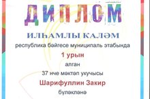 Күптән түгел шәһәркүләмендә уздырылган «Илһамлы каләм» Республика бәйгесенең муниципаль этабында 1нче урын алган 10 а сыйныф укучысы Шарифуллин Закирны чын күңелдән әлеге җиңүе белән котлыйбыз, аңа киләсе әдәби бәйгеләрдә яңадан яңа уңышлар теләп калабыз. Аны әзерләгән татар теле һәм әдәбияты укытучысы Нәҗметдинова Эльмира Факил кызына зур рәхмәт белдерәбез.