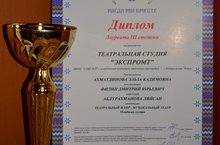 Поздравляем театральную студию «Экспромт» (руководитель Ахматдинова Э.К., постановщик Филин Д.Ю., хореограф Абдурахманова Л.И.), награжденную дипломом Лауреата III степени в международном конкурсе – фестивале в рамках проекта «Когда мы вместе» в номинации «Театральный жанр - музыкальный театр». Данный конкурс организован фондом «Планета талантов» при информационной поддержке Министерства Культуры РФ. Желаем коллективу студии дальнейших творческих успехов