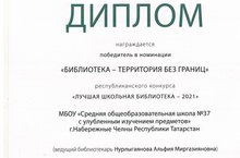 Поздравляем школьную библиотеку в лице библиотекаря Нурлыгаяновой Альфии Миргазияновны, награждённую дипломом победителя в номинаци «Библиотека-территория без границ» республиканского конкурса «Лучшая школьная библиотека - 2021». Желаем вам, Альфия Миргазияновна, счастья, творческих успехов, неиссякаемой энергии, вдохновения и удачи во всех начинаниях! Пусть ваша работа всегда будет увлекательной и захватывающей! Пусть каждый день приходят новые читатели и черпают знания в ваших стенах!