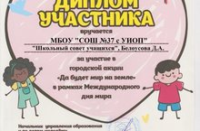 19 сентября школа принимала участие в акции "Да будет мир на Земле" и была награждена дипломом активного участника за подписью начальника Управления образования и по делам молодежи Исполнительного комитета В.Х.Харисова.