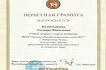 Благодарим учителя татарского языка и литературы Назмутдинову Эльмиру Факилевну, за подготовку призера республиканской олимпиады школьников по татарскому языку