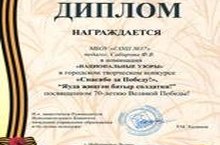 Поздравляем с победой учителя татарского языка и литературы Сабирову Файрузу Ваязовну в номинации "Национальные узоры" в городском творческом конкурсе "Спасибо за Победу!" "Яуда җиңгән батыр солдатка!" посвященном 70-летию Великой Победы! Желаем творческих успехов!