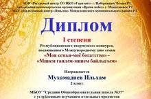 Учитель родного (татарского) языка и литературы Сахабетдинова Л.А. и ученик 2а класса Мухамадиев Ильхам приняли участие в Республиканском творческом конкурсе, посвященный Международному дню семьи «Моя семья- моё богатство» - «Минем гаиләм-минем байлыгым».