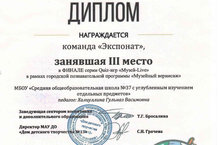 В финале серии Quiz-игр “Музей- Live” в рамкахгородской познавательной программы «Музейный вернисаж»команда школы “Экспонат” (Типцова Ангелина, Ускова Елена, Мухамедзянова Эмилия, Хабибуллин Эдгар, Сафина Арина, Перминова Полина) стали призёрами. Поздравляем учащихся и их руководителя Халиуллину Г.В. Так держать!