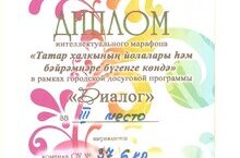 “Диалог” шәһәркүләм программасы кысаларында «Татар халкының йолалары һәм бәйрәмнәре бүгенге көндә» («Традиции и обычаи татарского народа в наше время») интеллектуаль марафонында катнашып призлы урын алган 6а сыйныфы укучылары: Ислам, Аэлита, Гүзәл, Алинаны котлыйбыз! (укытучылары: Сафина Л.Р., Хәлиуллина Г.В.)