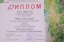 “Диалог” шәһәр программасы үткәргән “Иҗат һәм илһам” чарасында 10б сыйныф укучысы Лепехова Полина беренче урынга лаек булды. Полинаны һәм аның җитәкчесе Һәдия Хамбәловнаны җиңүләре белән котлыйбыз!