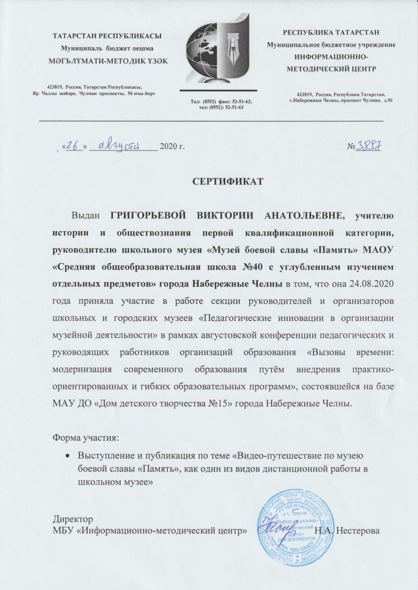 Сертификат о регистрации музея образовательной организации на Портале школьных музеев РФ