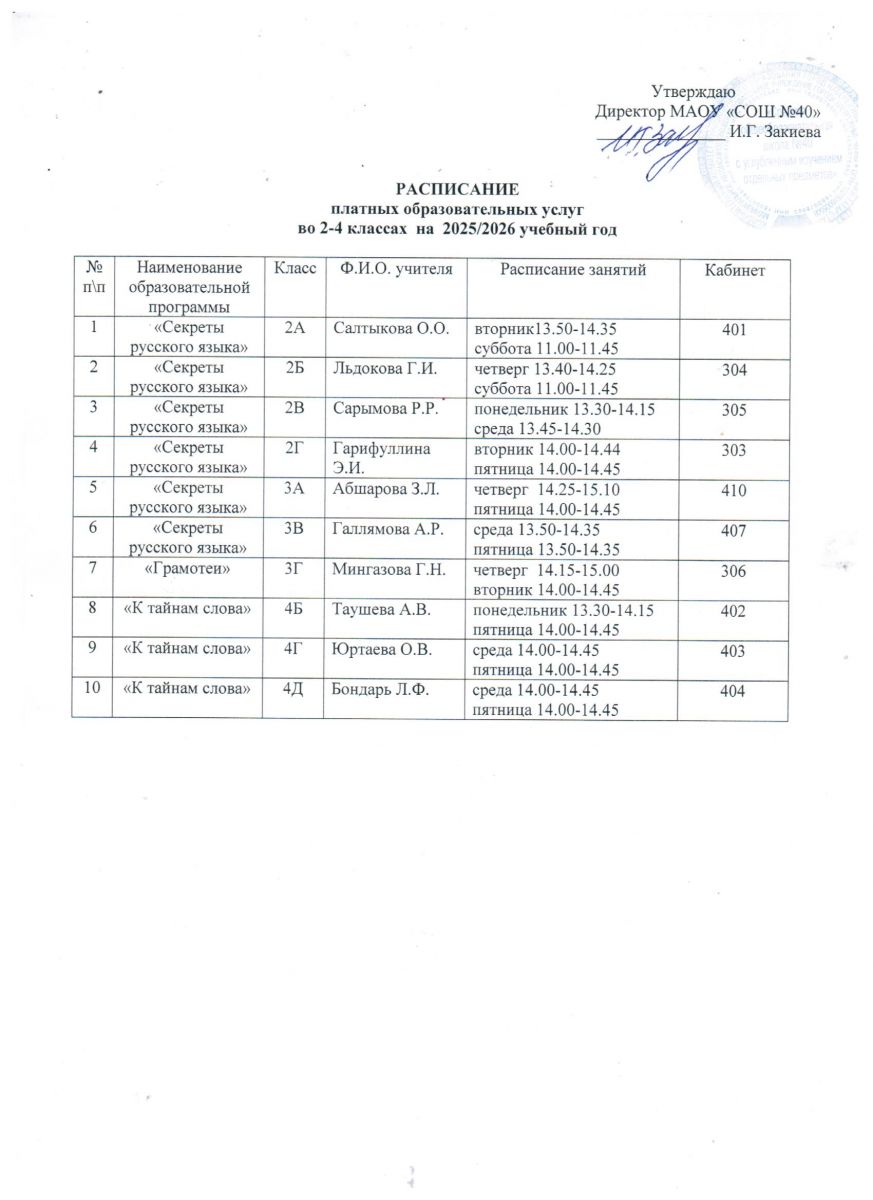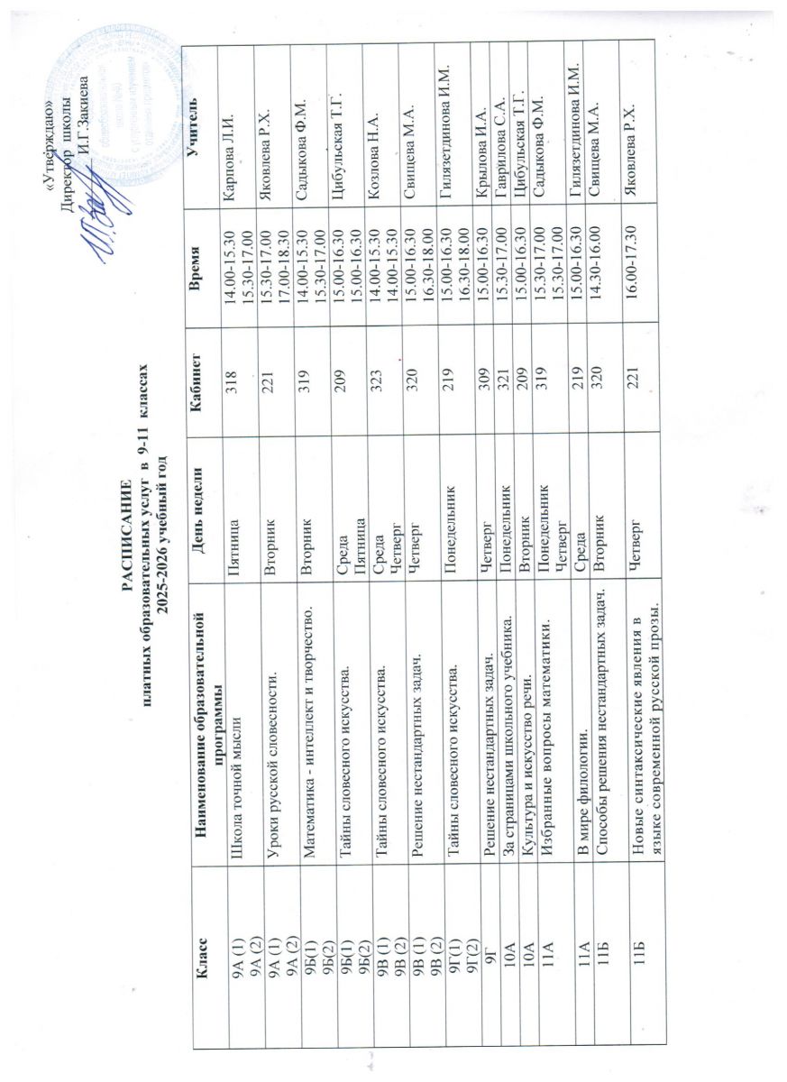 Расписание платных образовательных услуг 2025-2026 учебный год (2-4 классы, 9-11 классы)