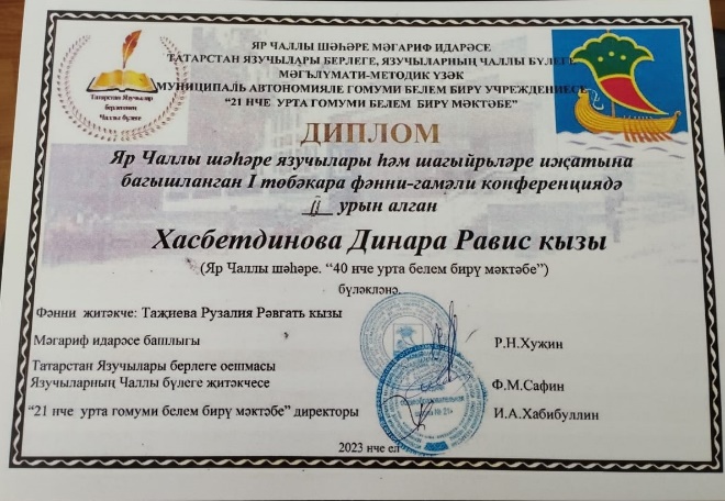 4 нче март көнне шәһәребезнең 21 нче гомуми белем бирү мәктәбендә “Яр Чаллы шәһәре язучылары һәм шагыйрьләре иҗатына багышланган I төбәкара фәнни-гамәли конференция”нең йомгаклау туры узды. 9Д сыйныф укучысы Хасбетдинова Динара сайлап алу турын уңышлы узып, йомгаклау турында катнашты һәм 2 нче урынны яулады. Фәнни җитәкчесе: татар теле укытучысы Таҗиева Р.Р. Аларны җиңүләре белән котлыйбыз!