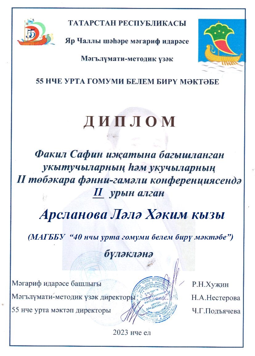 Татар теле һәм әдәбияты укытучысы Арсланова Л.Х. Факил Сафин иҗатына багышланган укытучыларның һәм укучыларның II төбәкара фәнни-гамәли конференциясендә II урынны яулады. Ләлә Хәкимовнаны призлы урынны алуы белән котлыйбыз, киләчәктә дә уңышлар телибез.