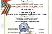 “Солдат булып тумыйлар” дип исемләнгән республика конкурсының муниципаль этабында 1Г сыйныф укучысы Ларионов Юрий җиңү яулады. Укытучысы: Юртаева О.В.
