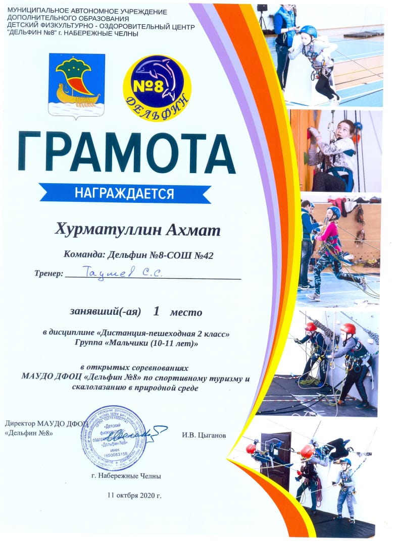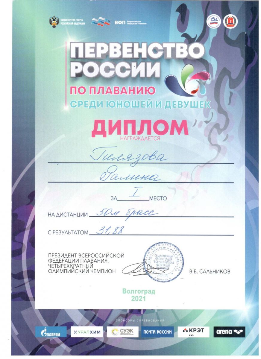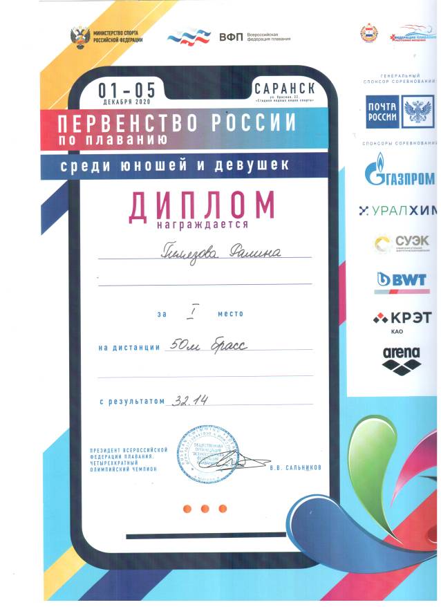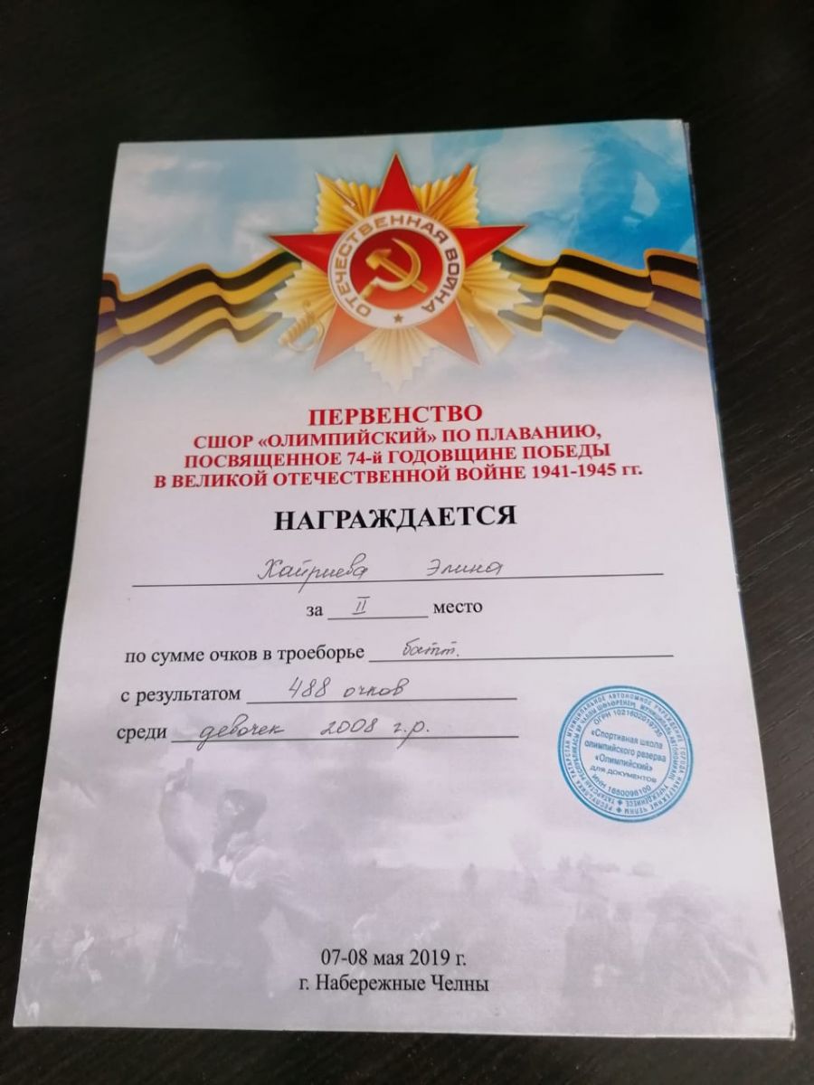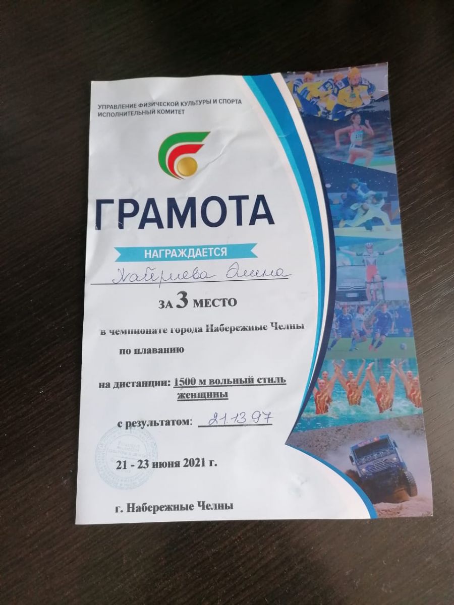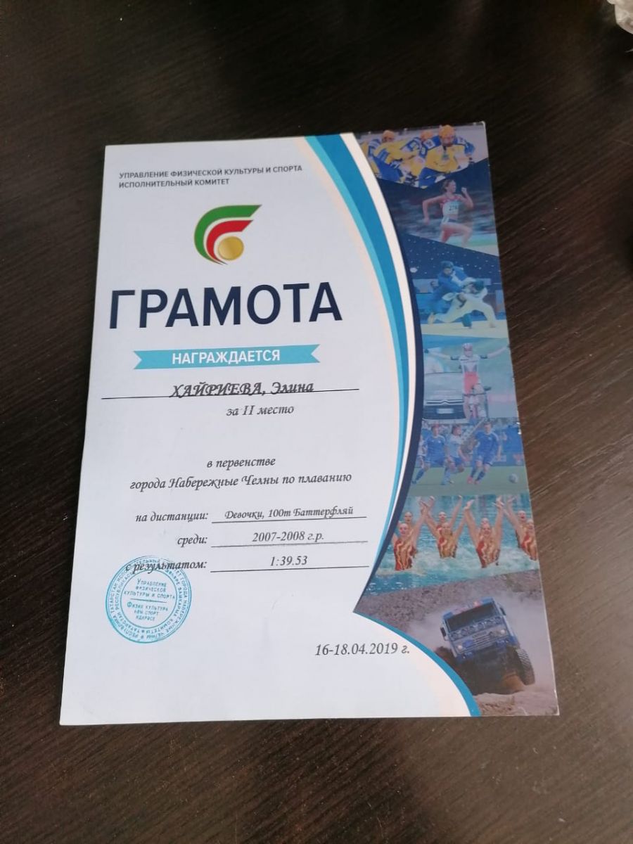 Грамота Первенства города Набережные Челны по плаванию 2 место