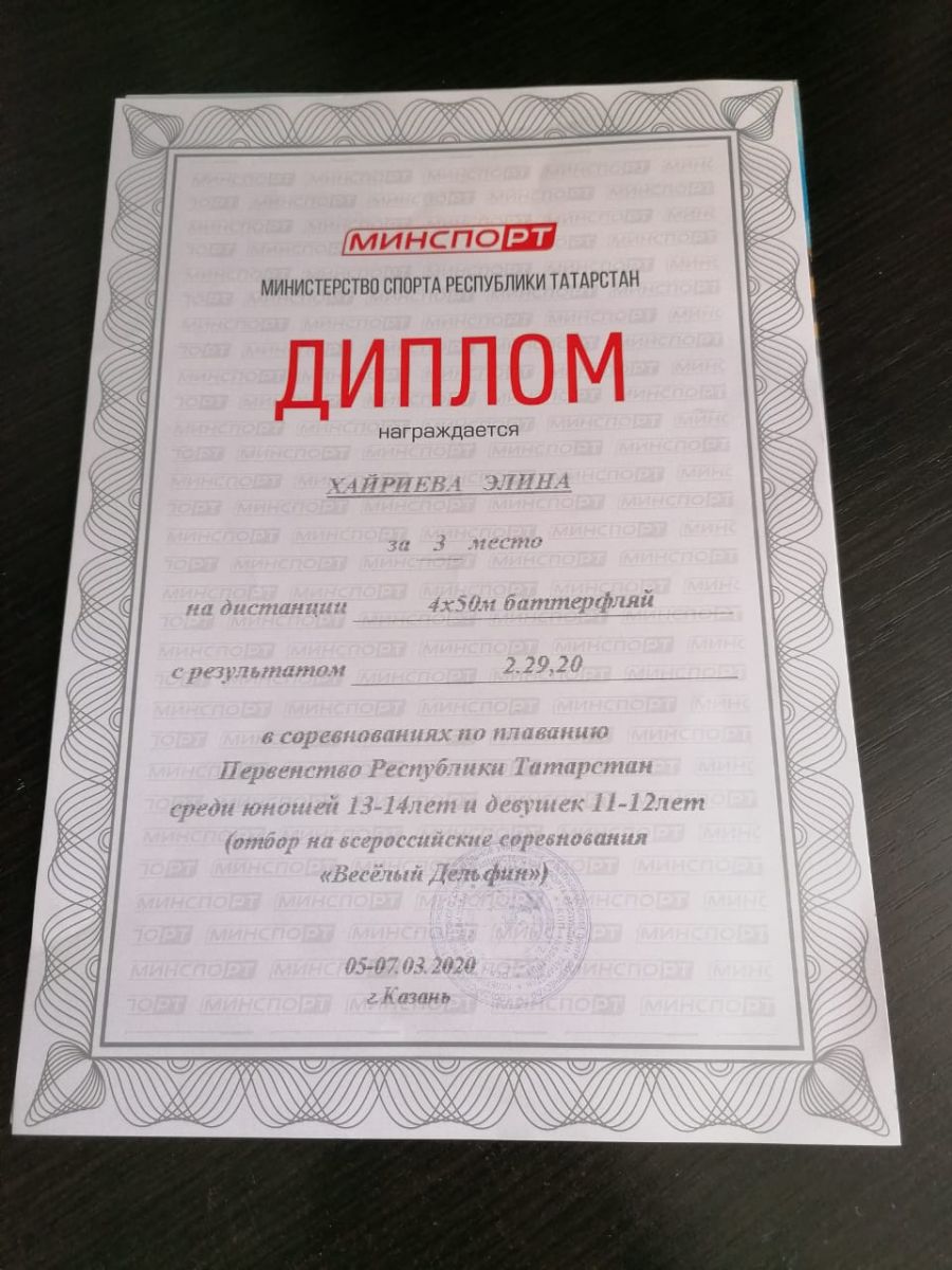 Диплом Соревнования по плаванию Первенства Республики Татарстан 3 место