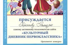 Республиканский проект «Культурный дневник первоклассника» реализуется с 1 октября 2014 года по 26 мая 2015 года для учеников первого класса образовательных учреждений Татарстана. . В рамках проекта завершился конкурс среди первоклассников и родителей по номинации «Первоклассник - самый активный пользователь" сайта «Культурный дневник первоклассника». В числе их наш учащийся 1 А класса Гараппов Рамиль. Поздравляем!
