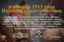 В этот день в 1915 году защитники крепости Осовец, против которых немцы применили отравляющие газы, смогли подняться в контратаку. Враг был настолько изумлен стойкостью и мужеством русских солдат, что оставил поле боя. Этот героический эпизод останется в истории как «атака мертвецов».