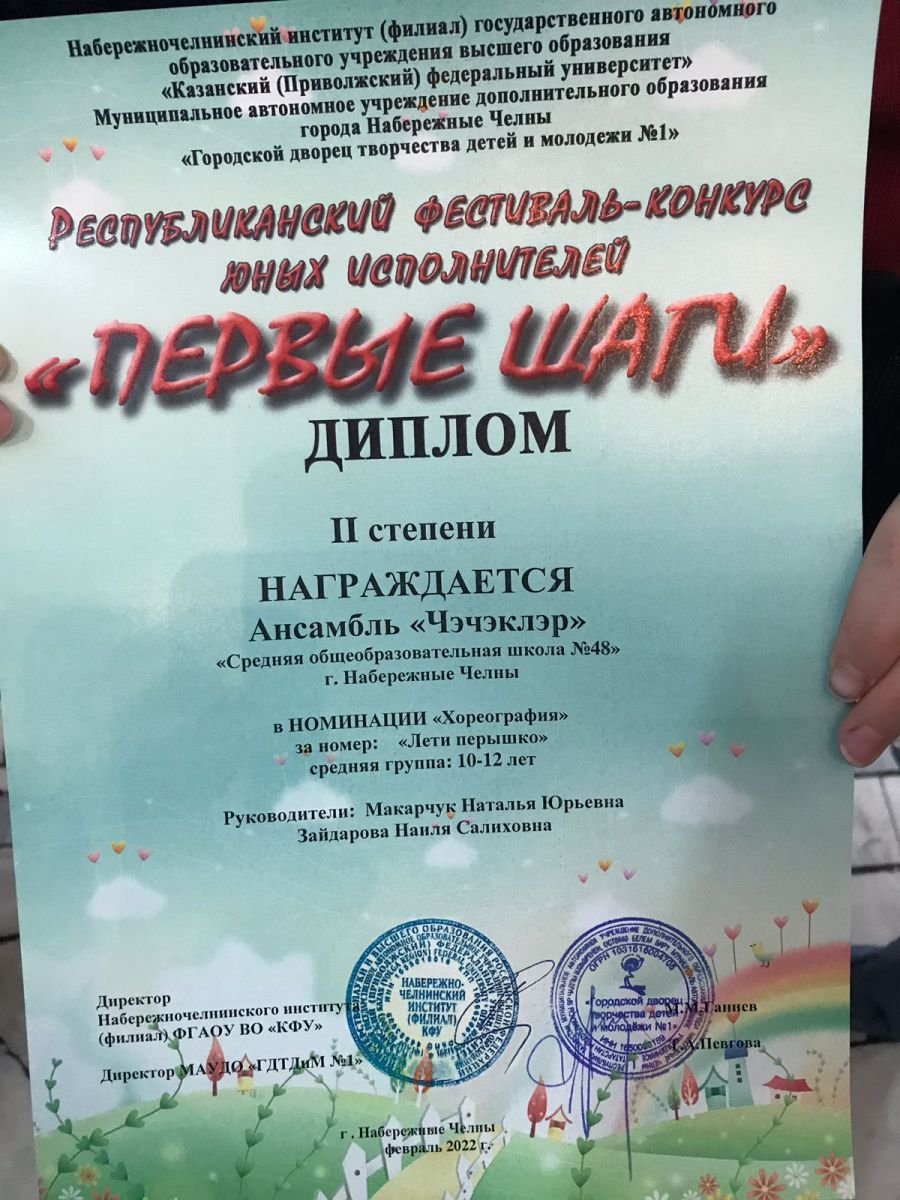 Сегодня, в ГЦДТ №1 проводился Республиканский фестиваль - конкурс юных исполнителей "Первые шаги". Ансамбль "Чэчэклэр" нашей школы приняла участие в этом конкурсе. Учащиеся награждены дипломом 2 степени. Молодцы,девочки!!! Успехов вам!