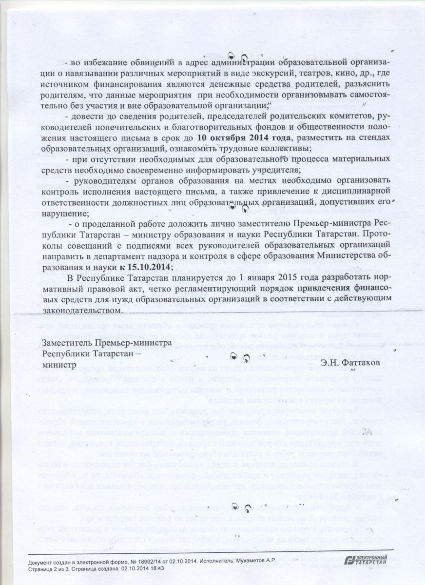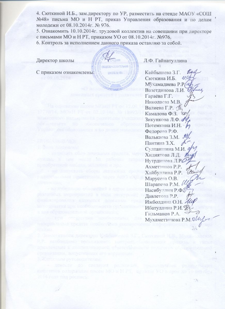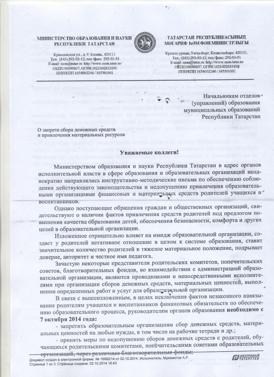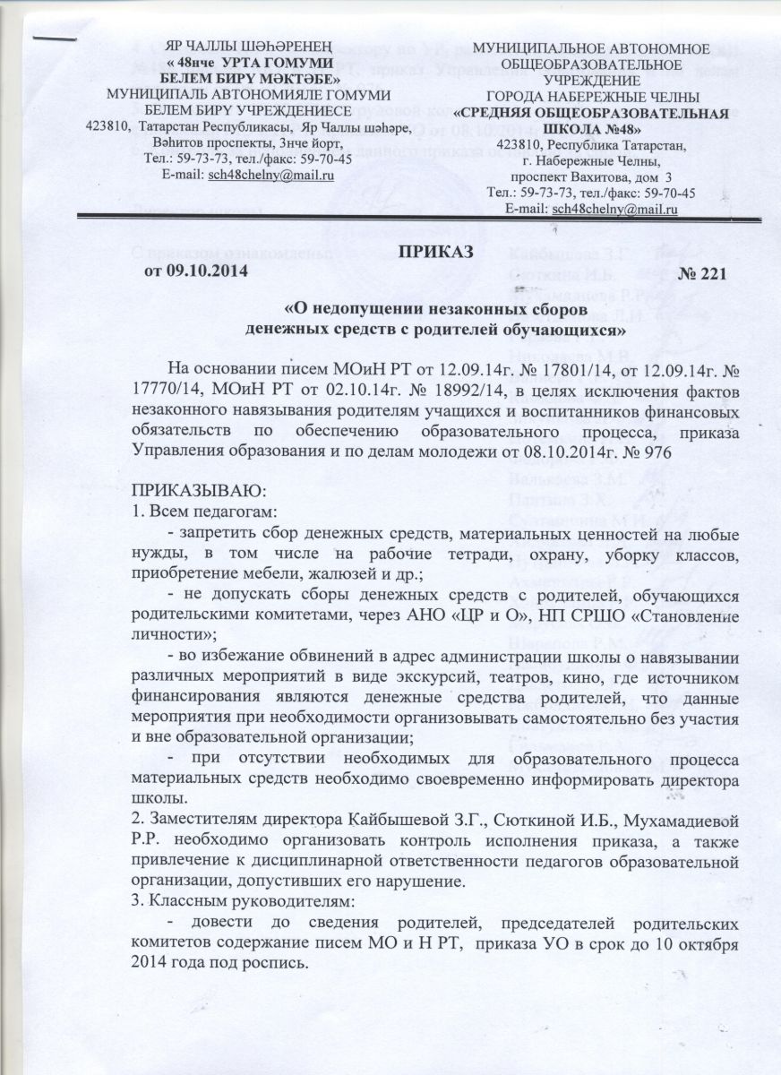 Приказы и письмо "О недопущении незаконных сборов денежных средств с родителей обучающихся"