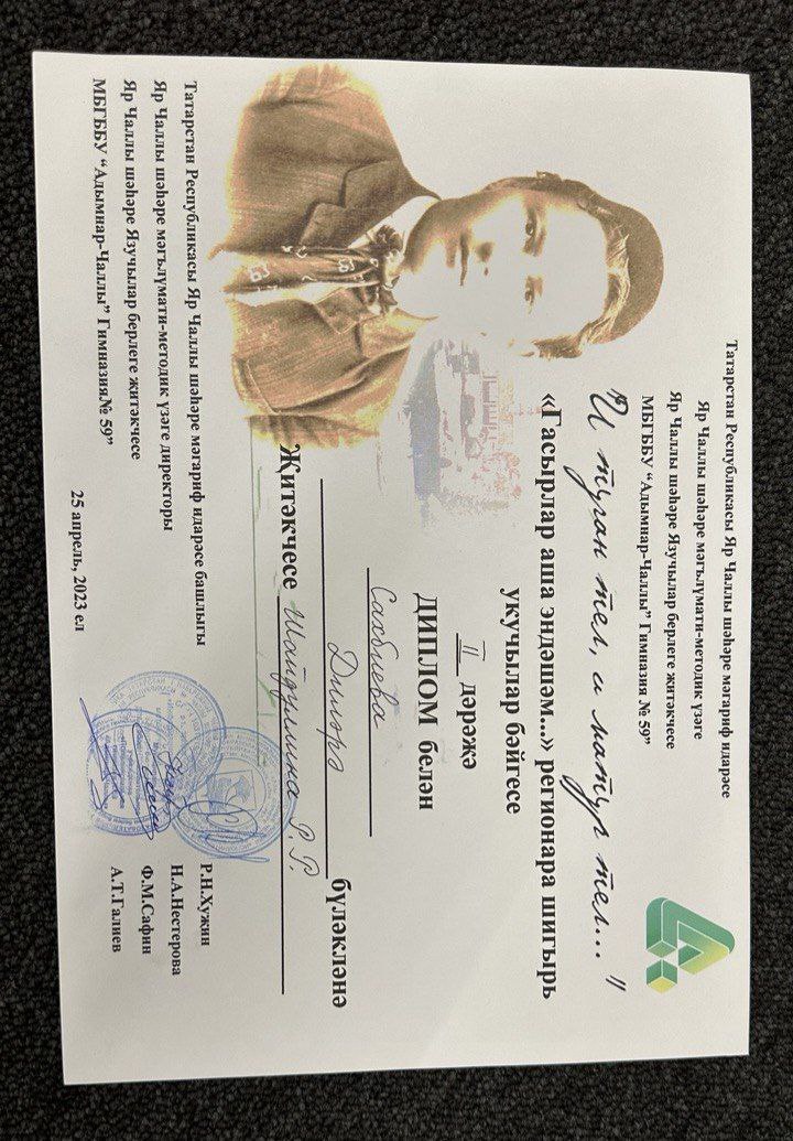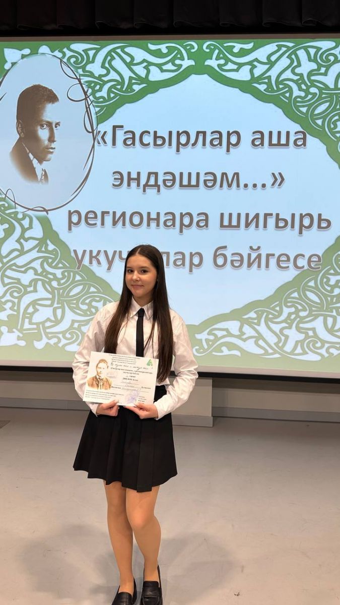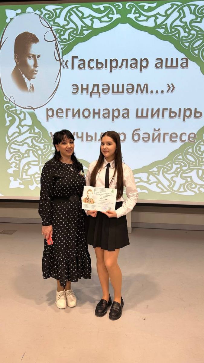 Конкурска Габдулла Тукай иҗат иткән лирика/ проза әсәсрләрен татар телендә сәнгатьле уку буенча видеоязмалар кабул ителде. Бәйгенең 1нче туры дистанцион форматта үтте, тирә-як район һәм шәһәрләрдән 150дән артык эш кабул ителде. Безнең мәктәпнең 9 нчы «а» сыйныфы укучысы Сәхбиева Диләрә сайлап алу турында җиңү яулап, 25 апрельдә 59 нчы “Адымнар-Чаллы” гимназиясендә бүләкләү тантанасында II дәрәҗә диплом белән бүләкләнде. Җитәкчесе: Шайдуллина Рузилә Рәшитовна. Котлыйбыз, алга таба да зур уңышлар теләп калабыз!