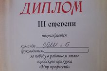 Наша школа награждена дипломом 3 степени за победу в районном этапе городского конкурса "Мир профессий - 2015".