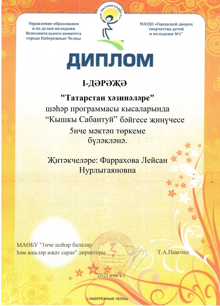 8 нче гыйнвар көнне “Татарстан хәзинәләре” программасы кысаларында “Кышкы сабантуй” бәйрәмендә 5 нче сыйныф укучылары бик теләп катнаштылар. Төрле спорт уеннарында көч сынаштылар. Бәйрәм балаларның чын күңелдән татарча биюләре белән тәмамланды. I дәрәҗә дипломга лаек булу- тагын да сөендерде.