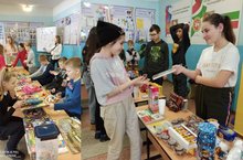 В день ярмарки фойе был заставлен партами-прилавками, на которых каждый класс выставил на продажу свои изделия. Столы просто ломились. На продажу были выставлены поделки из бисера, макраме, мягкие самодельные игрушки, вышитые крестиком и гладью салфетки и носовые платки,журналы,книжки, горы выпечки: печенье, орешки, вафли, пирожные. Мамы и бабушки, которые пришли за детьми также с удовольствием приняли участие в ярмарке в качестве покупателей)) Раскупили практически все!